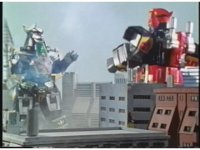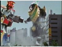 Dragonzord spins around and sparkily slashes Megazord with tail. They turn and face each other, then press together in an arm lock, before breaking loose, Mega sparkily punching Dragon in the chest. |