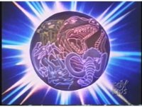 Sharp zoom out as Cyclops lands, spreads arms, then as he rushes at us, he changes into Tyrannosaurus Dinozord. |