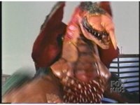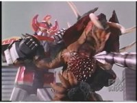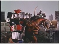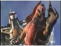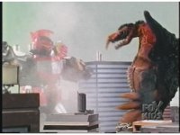 Dragonzord tail sparkily slashes Hatchasaurus. They lock arms, switch positions, then break off, when Hatchy tries to strike, Dragon grabs his arm and pins him as Tyrannosaurus' leg comes into the foreground. |