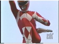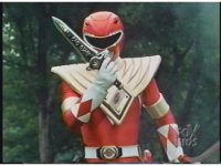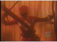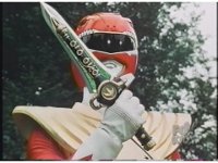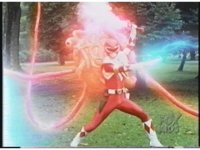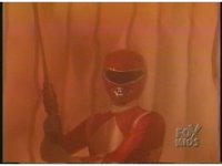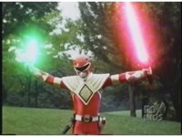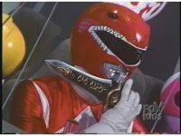 In dramatic slow motion, Red Ranger runs at the screen, spreads out arms as Dragon Dagger glows green and Power Sword glows red, whole body outlined with red energy as he slashes at us. |