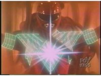 In dramatic slow motion, Red slashes glowing Power Sword into Cardiatron, causing him to crackle with blue electricity. Red then slashes the other direction with glowing Dragon Dagger,and in doing so, turns back to monster, posing with weapons as Cardiatron crackles then glows golden until he disintegrates in a reddish light, prompting him to ease up on pose . |