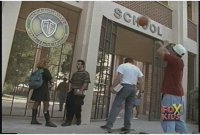 Exterior doorway of Angle Grove High School, guy passes by on skateboard as another bounces basketball off wall. |