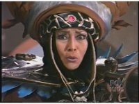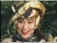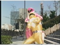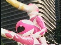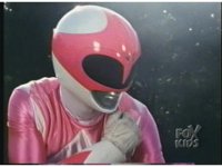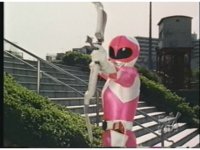 Zoom out from helmet, as Pink Ranger crosses Power Bow to her side then flings it upward. |