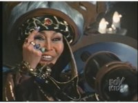 Slow zoom as Rita paces back and forth on back stairs of balcony, Twin Man and six Putties, also Scorpina, in crowd before her, while Goldar, Baboo & Squatt are behind her. As she talks, Putties get excited. Rita happily speaks, gestures arm, then makes slashing motion to them. |