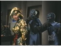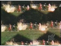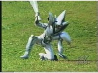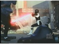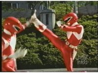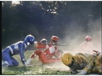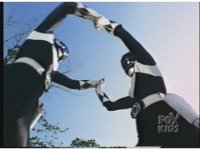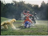 Slight zoom out as Rangers roll across the grass, Red quickly getting up and gripping his Power Sword, as Black also recovers. |