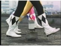 Close on legs of the five Twin Rangers as they walk across the rooftop in almost perfect step together. |