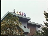Upward far shot of five Twin Rangers standing on roof edge. |
