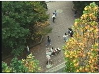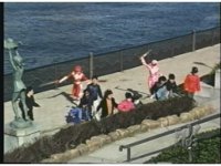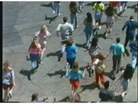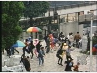 Far angle of dark-haired citizens fleeing plaza, as the Twin Rangers start pushing them around and getting rough with them. |