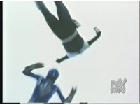Downward shot on real Red lying on back, raising Power Sword to block Twin Red's slashing strike. The evil one presses blade closer, until the good one kicks up and knocks him back. |