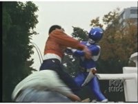 As one guy falls down, Blue Twin Ranger grabs another by his shirt and manhandles him abruptly, people fleeing about. |