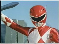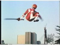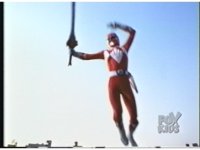 Close up of Red Ranger as he looks up, gestures arms while holding Power Sword, and leaps up. |