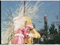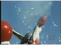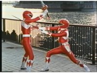 Close on Red Twin Ranger's Power Sword, held high back and above head, when suddenly the demorphed version of the Power Sword flings in and smacks sword, causing a bright flash of sparks and smoke. |