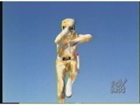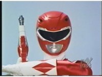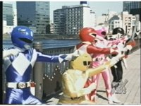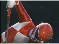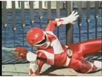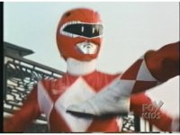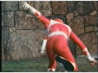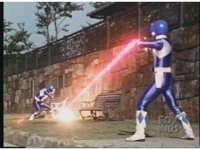 After Red Ranger lands, the other four Rangers join his side, each grabbing onto the Power Blaster or (in the girls' cases) touching his shoulders. |