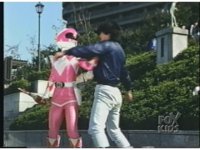 Pink Twin Ranger picks up white plastic chair and attacks visibly freaking-out dark-haired man with the bottom of it. |