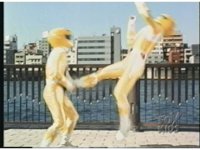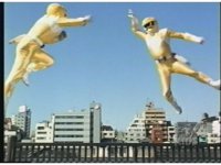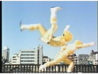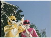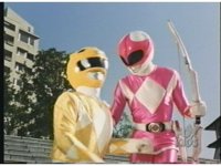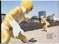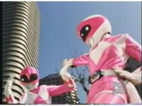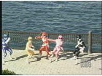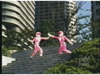 Very Japanese citizens rush away from the Rangers, Yellow jumping down off trashed car, Pink smacking guy away, Black dropping cement pillar, before the evil Twins all pose together victorious in terrorizing Angel Grove. |