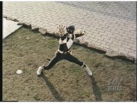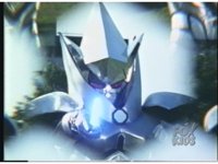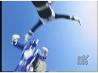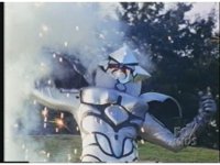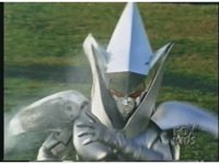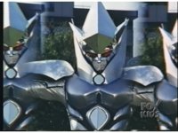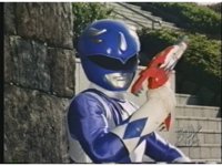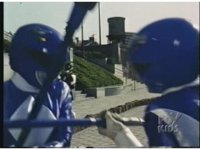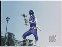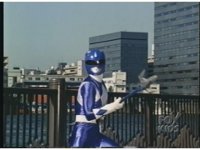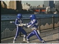 Zoom out from helmet, as Blue Ranger holds both ends of Power Lance in the air, then throws them upward. |