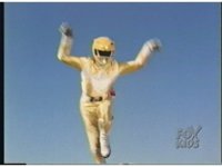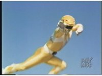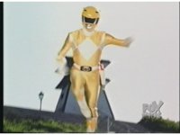 Zoom out from helmet, as Yellow Ranger twirls Power Daggers, crosses arms, then throws them upward. |