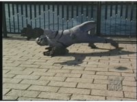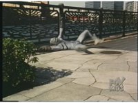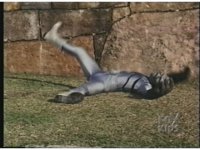 Quick zoom out as Twin Black falls on back on lawn patch, but gets up and poses ready for heroic double to follow. |