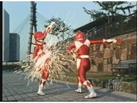 Close on the Twin Rangers amid crowd, as Red has his Blade Blaster out, causing the very Asian citizens to back up as he raises his weapon and fires several red lasers upward to our right, then to our left. |