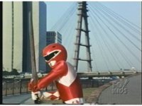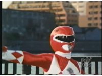 Red Ranger comes into view, raises left fist, then holds up Blade Blaster against left forearm. |