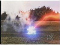 The spinning-prismed Rangers are knocked back and down by a series of erupting spark bursts and smoke. |