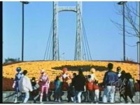 Zoom out really far away as the five Rangers pose between bridge top and yellow flowerbed. |