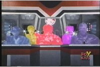 Slow zoom out from Red in Megazord cockpit, as he lowers fist, nod-talks, then leads team in spreading elbows out, then doing the Nazi salute. |