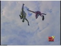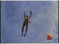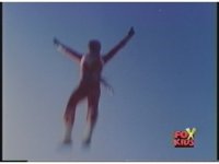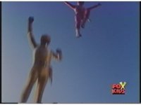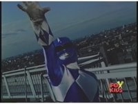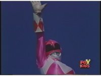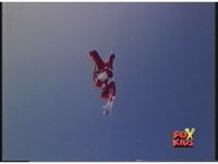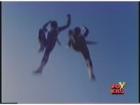 Red Ranger falls through the air, arms stretched out, kinda Superman style. |