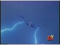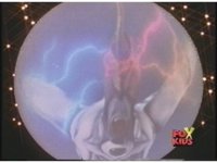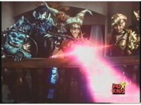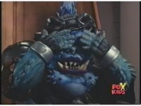 Lokar's doofy smile turns into a Popeye-esque wince as he and Cyclopsis are struck by spark bursts and crackles of blue electricity. |