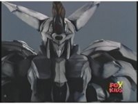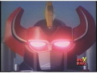 Close on Megazord's head as horns fold out and eyes flash. |