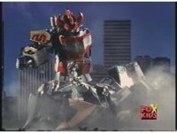 Close on Dragonzord, chest smoking, reaching out and growling before turning and whipping back tail. |