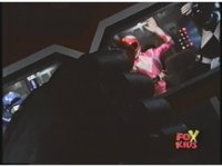 Right-tilted Megazord cockpit showers a quick bursting of sparks upon the Rangers inside, zoom in on Pink who stands up and nod-talks around. |