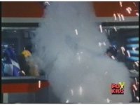 Right-tilted Megazord cockpit gets a bright burst in front of the window, with a lingering smoke plume as the Rangers get shaken up. |