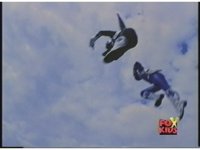 Black & Blue Rangers leap, side by side, down from upper right in side shot of cloudy sky. |