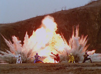 Footage from "Ninja Quest, Part I", covering the Rangers watching helplessly as their Megazords explode. |