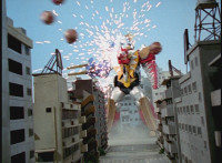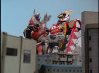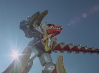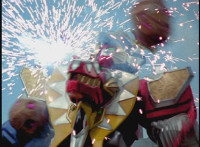 Tyrannozord transforms into the body, Tricerazord into the right arm, the head pops out, then the body leaps up and Pterazord locks on, before the helmet locks onto the head. Thundersaurus Megazord floats completed in front of an explosion. |