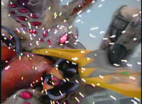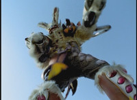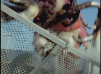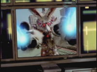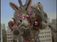 Donkeyvac begins to fire fruit from his nostrils at Thundersaurus Megazord, spark bursting it and shaking up the cockpit and it repeatedly fires. Next, Donkeyvac zaps it with electricity, which turns from blue to red as it reverses back into the monster, drawing the Megazord closer until it makes bodily contact with Donkeyvac's arms. The monster's eyes flash, and the Megazord crackles and sparks, writhing about, while in the cockpit, Red nod-talks to his Morpher. |