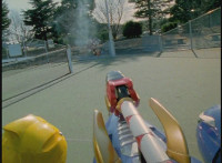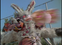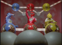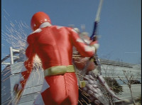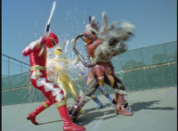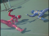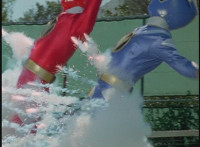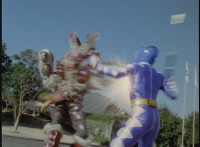 Red dives past Donkeyvac, who then sparkily strikes Blue away, before turning and doing the same to Red, before running off, the two Rangers giving chase. |