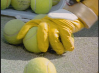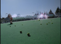 Yellow rolls over to a pile of tennis balls and picks up a racket and a few of the balls, stands up, holds them ready, and her visor shimmers. Donkeyvac approaches from across the court. |