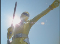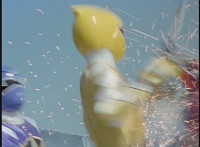 Yellow readies Thundermax Saber and leads the team in leaping up and slashing their blades forth at Donkeyvac, who blocks their weapons, then sparkily bashes them back, Yellow flung across the sky. |