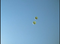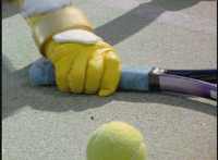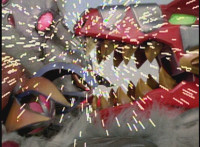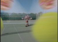 Leaping up, Yellow hits the balls with the racket, sending them flying past Donkeyvac's fruit projectiles, and clogging up his nostrils upon impact, causing him to spark burst. |