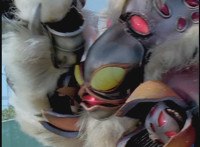Thundersaurus Megazord's Tyrannozord chest chomps onto Donkeyvac's nose with sparkle results, prompting the monster to release the Megazord and staggers back, rubbing his schnoz. |