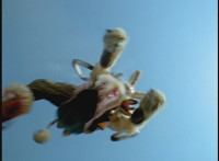 Donkeyvac erupts, and is flung into the fence, breaking it on impact. |