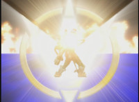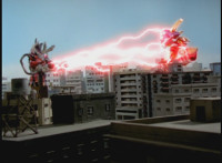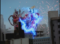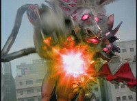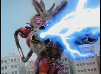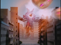 A ball rises up and causes stormclouds to appear in the blue sky, raining suddenly, which falls onto the monster chunks, merging them into a purple glowing mass. As the stormclouds vanish, the purple glowing mass rises up and forms into a gigantic body with a flash of light. |