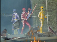 The Rangers brace around the Z-Rex Blaster as its aimed forth at the smoking Donkeyvac, Yellow speaks, then does Red. |