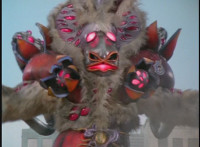 Cuts prior shot of monster running forth; cuts follow-ups of Rangers using blasters on him. |