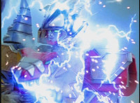 Donkeyvac punches his fists forth and zaps electricity from them. |