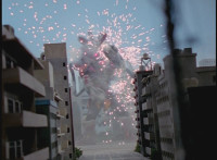 Jabbed by the tail-arm, Donkeyvac bursts, crackles, collapses, and explodes massively, sending a green shimmer flying away into the city. |