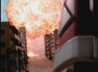 The Z-Rex Blaster beam hits Donkeyvac, exploding him, leaving behind a rain of meat chunks on flames as the Rangers watch. |