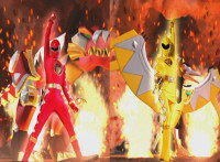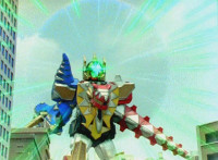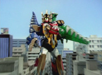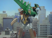 The Rangers place hands to the control orbs, causing them to spin to life, the Rangers nod-talking while holding palms to their glowing control orbs. Tyrannozord transforms into the body, Tricerazord into the right arm, the head pops out, then the body leaps up and Pterazord locks on, before the helmet locks onto the head. The three cockpits merge into one, as Thundersaurus Megazord floats completed in front of an explosion. The Rangers nod-talk and punch forth. |
